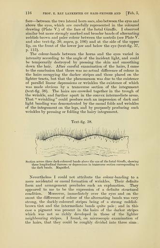 Keywords: PZSL1907Page116.png Giraffa camelopardalis antiquorum ™‚ × G c wardi ™ Giraffa camelopardalis antiquorum <small>Swainson 1835</small> ™‚ × G c giraffa <small>von Schreber 1784</small> ™ foetus en Skin section through bands of dark hairs on top of head of hybrid giraffe foetus Kordofan Giraffe male × South African Giraffe female Recovered at about 350 days of gestation two-third term from mother which died in London Zoo on May 5 1906 Bands correspond to the furrows visible in the section Proceedings of the Zoological Society of London http //archive org/details/proceedingsofzoo19071446zool vol 1907 issue 1 http //archive org/stream/proceedingsofzoo19071446zool page/116/mode/1up page 116 1907 E Ray Lankester text PD-old <gallery> File PZSL1907Plate05 png Same specimen head from above File PZSL1907Page106 png Same specimen partially dissected head from right lateral File PZSL1907Page107 png Same specimen left horn File PZSL1907Page108 png Same specimen pattern of hairs between horn bases File PZSL1907Page112 png Same specimen skull from right lateral File PZSL1907Page115 png Same specimen head from left lateral File PZSL1907Page117 png Same specimen section of skin of forehead File PZSL1907Page118 png Same specimen pattern of hairs on forehead </gallery> 1906 Giraffa camelopardalis hybrid foetus from London Zoo Animal hair PZSL 1907-1 |