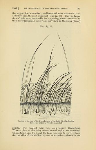Keywords: PZSL1907Page117.png Giraffa camelopardalis antiquorum ™‚ × G c wardi ™ Giraffa camelopardalis antiquorum <small>Swainson 1835</small> ™‚ × G c giraffa <small>von Schreber 1784</small> ™ foetus en Skin section from forehead of hybrid giraffe foetus Kordofan Giraffe male × South African Giraffe female Recovered at about 350 days of gestation two-third term from mother which died in London Zoo on May 5 1906 Note three different types of foetal hair Proceedings of the Zoological Society of London http //archive org/details/proceedingsofzoo19071446zool vol 1907 issue 1 http //archive org/stream/proceedingsofzoo19071446zool page/117/mode/1up page 117 1907 E Ray Lankester text PD-old <gallery> File PZSL1907Plate05 png Same specimen head from above File PZSL1907Page106 png Same specimen partially dissected head from right lateral File PZSL1907Page107 png Same specimen left horn File PZSL1907Page108 png Same specimen pattern of hairs between horn bases File PZSL1907Page112 png Same specimen skull from right lateral File PZSL1907Page115 png Same specimen head from left lateral File PZSL1907Page116 png Same specimen section of skin between horn bases File PZSL1907Page118 png Same specimen pattern of hairs on forehead </gallery> PZSL 1907-1 1906 Giraffa camelopardalis hybrid foetus from London Zoo Animal hair |
