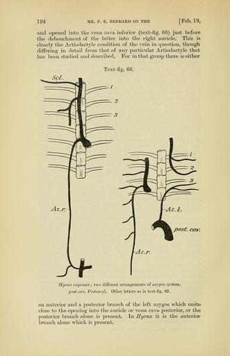 Keywords: PZSL1907Page194.png Hyrax capensis Procavia capensis <small> Pallas 1766 </small> en Parietal veins of the Rock Hyrax from ventral typical layout right and right side of variant layout left found in one female possibly congenital aberration 1/2/3 first ribs Az l hemiazygos vein Az r azygos vein post cav inferior vena cava Scl subclavian vein Proceedings of the Zoological Society of London http //archive org/details/proceedingsofzoo19071446zool vol 1907 issue 1 http //archive org/stream/proceedingsofzoo19071446zool page/194/mode/1up page 194 1907 F E Beddard text PD-old PZSL 1907-1 Procavia capensis anatomy Mammal circulatory system Veins inferior vena cava |