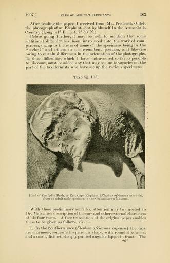 Keywords: PZSL1907Page383.png Elephas africanus capensis Addo Bush near Port Elizabeth Loxodonta africana <small> Blumenbach 1797 </small> ™‚ en Head of adult male African Bush Elephant from Addo Elephant National Park South Africa in Albany Museum Grahamstown Proceedings of the Zoological Society of London http //archive org/details/proceedingsofzoo19071446zool vol 1907 issue 2 http //archive org/stream/proceedingsofzoo19071446zool page/383/mode/1up page 383 1907 R Lyekker text PD-old PZSL 1907-2 Loxodonta africana heads Mammals of Addo Elephant National Park Albany Museum Taxidermied elephants |