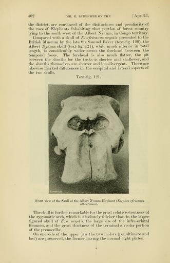 Keywords: PZSL1907Page402.png Elephas africanus albertensis southern end of the Albert Nyanza Loxodonta cyclotis <small> Matschie 1900 </small> en Skull of adult African Forest Elephant shot by Stanley C Tomkins SW of Lake Albert Orientale Province Democratic Republic of the Congo and presented to Natural History Museum from frontal Proceedings of the Zoological Society of London http //archive org/details/proceedingsofzoo19071446zool vol 1907 issue 2 http //archive org/stream/proceedingsofzoo19071446zool page/402/mode/1up page 402 1907 Butterworth PD-old PZSL1907Page402 extracted png PZSL 1907-2 Loxodonta cyclotis anatomy |