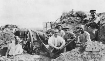 Keywords: QF 12 pdr and crew Gallipoli AWM P08137.jpeg AWM caption Group of Australian and British artillerymen beside a well dug in 12 pdr naval gun Lieutenant Lt http //deepthought hass adfa edu au 8080/showPerson pid 222646 John Heathcote Newmarch MC 1st Division Artillery is sitting on the gun's trail and wearing a white shirt and no hat The recommendation for Lt Heathcote's award is as follows On 3rd June moved 12 pdr naval gun to forward position On 4th June brought oblique fire to bear on Turkish works and entrenchments During the engagements on these and subsequent dates the fire from this gun was very effective This gun remained in action although continuously under heavy howitzer fire On 12th June the gun emplacement was completely demolished by shell fire The gun was then withdrawn On 4th August he moved a 15 pdr gun into position in rear of our firing line on the right of the 42nd Division On 6th August whilst in command of this gun he was dangerously wounded The fire from this gun was most effective Left Anzac on 6 August 1915 P08137 Credit line J Newmarch circa June-July 1915 author PD-AustraliaGov World War I forces of Australia at Gallipoli QF 12 pounder 8 cwt World War I forces of Britain at Gallipoli Black and white photographs |
