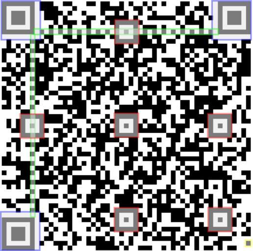 | Keywords: QR Code with desc.svg Budowa kodu kreskowego QR Code<br/>Obszar zaznaczony niebieskÄ… ramkÄ… “ wzór wyszukiwania 3xwzór pozycji oraz separatory<br/>Obszar zaznaczony zielonÄ… ramkÄ… “ wzór synchronizacji 2x <br/>Obszar zaznaczony czerwonÄ… ramkÄ… “ wzory osiowe<br/>Obszar zaznaczony żółtÄ… ramkÄ… “ pojedynczy moduÅ‚<br/>UWAGA Grafika nie przedstawia obowiÄ…zkowego marginesu o szerokoÅ›ci 4 modułów z każdej strony kodu <br/> Own 2007-03 Maly LOLek PD QR Code Diagrams | ||||