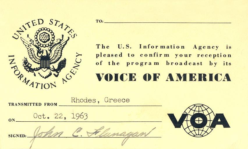 | Keywords: QSL VOA Rhodes-1963.jpg en QSL card confirming a reception report for a Voice of America broadcast aired via Rhodes Greece https //www flickr com/photos/alcue/453558387 Voice of America signed by John C Flanagan 1963-10-22 PD-USGov-VOA QSL cards Voice of America |