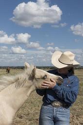 Keywords: quarter horse colt cowgirl ranch equine equestrian rancher head playing portrait pasture petting white agriculture animal venus texas usa