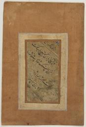 | Keywords: Quatrain on Divine Mercy WDL6867.png Artwork ru и -'Али Хусайни Ха ави п иблизительно 1476 1543 гг fr Mīr ʻAlī Ḥusaynī Haravī 1476-1543 env en Mīr ʻAlī Ḥusaynī Haravī approximately 1476-1543 zh 米尔·阿里·乌萨尼·哈拉维,约 1476-1543 年 pt Mīr ʻAlī Ḥusaynī Haravī aproximadamente entre 1476 e 1543 ar مير علي حسيني الهَرَوي، حوالي 1476-1543 es Mīr ʻAlī Ḥusaynī Haravī circa 1476-1543 ru Четве остишие о божественном милосе дии fr Quatrain sur la miséricorde divine en Quatrain on Divine Mercy zh 神的仁慈四行诗 pt Quadra sobre a piedade divina ar رباعية في الرحمة الإلهية ru В этом каллиг афическом ф агменте соде жится <em> убаи</em> четве остишие выполненное пятистопным ямбом несколько слов из кото ого были ут ачены из-за пов еждения водой Стихотво ение начинается с об ащения к Богу как к Ya Malak al-Muluk Ца ю Ца ей после чего милосе дие Господа восхваляется подобно п оливному дождю кото ый позволяет людям об ести <em>fana' </em> аство ение в Божестве Такой духовный асцвет напоминает ост астений на пове хности п очного камня а задней сто оне данного ф агмента сделана надпись авлана Султан и -Али для указания личности каллиг афа имя кото ого было уте яно или сте то с лицевой сто оны ф агмента Если п инять это указание на авто ство то можно п едположить что абота была выполнена знаменитым пе сидским каллиг афом и -Али Хусайни Ха ави около 1476 1543 гг кото ый аботал в Ге ате сов еменный Афганистан в XVI веке пока не был п изван в Буха у сов еменный Узбекистан в 1528 1529 гг п авителем из династии Шейбанидов Убайдулла-ханом Узбеком и -Али был не только масте ом каллиг афии и создателем письма насталик но и полноп авным поэтом Эти ст оки могли быть написаны им самим для одного из своих пок овителей чтобы п овести поэтическую па аллель между всемогуществом Господа и властью земного п авителя <br>Каллиг афия пе сидская; Иллюмини ование укописей; Исламские укописи; Письмо насталик; Пе сидская поэзия; Поэзия fr Ce fragment de calligraphie inclut un <em>ruba'i</em> quatrain en pentamètre iambique dont quelques mots ont disparu en raison de dommages causés par l'eau Le poème commence avec une invocation à Dieu l'appelant « Ya Malak al-Muluk » le roi des rois puis il loue la miséricorde de Dieu qui est comme une pluie torrentielle permettant aux hommes d'atteindre l'état de <em>fana'</em> anéantissement en Dieu Cet éveil spirituel est semblable à la pousse des plantes sur une roche dure l'arrière de ce fragment l'attribution « Mawlana Sultan Mīr ʻAlī » est inscrite et permet d'identifier le calligraphe dont le nom fut perdu ou effacé sur le recto du fragment Si cette attribution est acceptée on peut présumer que cette œuvre fut réalisée par l'éminent calligraphe persan Mīr ʻAlī Ḥusaynī Haravī 1476 1543 env qui fut actif dans la ville d'Hérat aujourd'hui en Afghanistan au cours du XVI<sup>e</sup> siècle jusqu'à ce qu'il fut emmené à Boukhara en actuel Ouzbékistan en 1528 ou 1529 par le souverain chaybanide 'Ubaydallah Khan Uzbek Mīr ʻAlī fut non seulement un maître de la calligraphie et le créateur de l'écriture nasta'liq mais il fut également un poète à part entière Il a peut-être écrit ces vers pour l'un de ses bienfaiteurs dans le but d'établir un parallèle poétique entre la toute-puissance de Dieu et l'autorité du souverain sur terre <br>Calligraphie persane; Enluminures; Manuscrits islamiques; Écriture nastaliq; Poésie persane; Poésie en This calligraphic fragment includes a <em>ruba'i</em> iambic pentameter quatrain a few words of which are lost due to water damage The poem begins with an invocation to God as Ya Malak al-Muluk the King of Kings and then praises God's mercy as a torrential rain which allows humans to find <em>fana' </em> annihilation in the Divine This spiritual blossoming resembles the growth of plants on the surface of a hard stone On the back of this fragment appears the inscribed attribution Mawlana Sultan Mīr ʻAlī intended to identify the calligrapher whose name was either lost or erased on the fragment's recto If this attribution is accepted then one may conjecture that this work was executed by the great Persian calligrapher Mīr ʻAlī Ḥusaynī Haravī circa 1476 1543 who was active in the city of Herāt in present-day Afghanistan during the 16th century until he was taken to Bukhara present-day Uzbekistan in 1528 29 by the Shaybanid ruler 'Ubaydallah Khan Uzbek Mīr ʻAlī was not only a master calligrapher and the creator of Nasta'liq script but a poet in his own right These lines may well have been written by him for one of his benefactors with the purpose of drawing a poetic parallel between God's omnipotence and the earthly ruler's authority <br>Calligraphy Persian; Illuminations; Islamic manuscripts; Nasta'liq scri