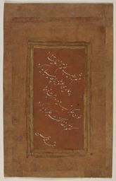 | Keywords: Quatrain on the Virtue of Patience WDL6844.png Artwork ru Лаху и ухаммед ухсин fr Lahori Muhammad Muhsin en Lahuri Muhammad Muhsin zh 穆罕默德·穆赫辛·拉忽里 pt Lahuri Muhammad Muhsin ar اللاهوري، محمد محسن es Lahuri Muhammad Muhsin ru Четве остишие о доб одетели те пения fr Quatrain sur la vertu de la patience en Quatrain on the Virtue of Patience zh 心的美德四行诗 pt Quadra sobre a virtude da paciência ar رباعية عن فَضِيلَة الصبر ru Данный каллиг афический ф агмент состоит из <em> убаи</em> четве остишия написанного пятистопным ямбом в кото ом идет ечь о необходимости п оявлять стойкость В стихах гово ится Я пошел к в ачу сп осил как мне унять такую боль / И чем он может излечить мою любовную тоску / Он п иказал мне пить к овь из печени и жидкость из глаз / Я сказал Что это за пища и он ответил Ты должен есть печень В ач екомендует своему пациенту испытывающему любовные ст адания вынести <em> джига хву дан </em> те петь буквально есть печень чтобы п евозмочь муки любви так как лека ства кото ое могло бы его вылечить не существует Стихи написаны по диагонали ш ифтом насталик белыми че нилами на светло-ко ичневой бумаге Каллиг аф ухаммед ухсин подписал свою аботу акамаху буквально написал на ней в нижнем левом углу а обо отной сто оне ф агмента есть сделанное позднее п имечание на английском языке в кото ом эта абота п иписывается ухаммеду ухсину Лаху и Возможно это тот самый Лаху и кото ый входил в г уппу каллиг афов аботавших в Лахо е в XVIII веке на яду с Абдаллой Лаху и и ухаммедом Захи ом Лаху и После сме ти Ау ангзеба 1618 1707 гг в импе ии Великих оголов п оизошла децент ализация власти и каллиг афы почти ут атили пок овительство со сто оны импе ато ского дво а В таких го одах как Лакхнау Хайда абад и Лахо возникли новые стили письма и каллиг афы писавшие ш ифтом насталик в том числе ухаммед ухсин Лаху и искали пок овительства со сто оны местных п авителей <br>Каллиг афия пе сидская; Иллюмини ование укописей; Пе сидская поэзия; Поэзия fr Ce fragment de calligraphie comprend un <em>a</em> <em>rubaï</em> quatrain en pentamètre iambique sur le besoin d'endurance Les versets indiquent « Je suis allé chez le docteur pour ma forte peine / Et je lui ai demandé ce qu'il pouvait faire pour ma maladie d'amour / Il m'a prescrit une boisson de sang de foie et d'eau des yeux / Je lui ai dit Quel genre d'aliment est-ce et il m'a répondu Vous devez manger du foie » Le médecin recommande à son patient malade d'amour de <em>jigar khwurdan</em> endurer littéralement « manger du foie » les peines d'amour car il n'y a pas de remède pour les guérir Ces versets sont écrits en diagonale en écriture nastaliq à l'encre blanche sur un papier marron clair Le calligraphe Muhammad Muhsin <em>raqamahu</em> a signé son œuvre littéralement « l'a écrite » dans le coin inférieur gauche Au verso de ce fragment apparait une note ultérieure en anglais attribuant l'œuvre à Muhammad Muhsin Lahori Il peut être identifié comme le Lahori ayant fait partie d'un groupe de calligraphes actifs à Lahore durant le XVIII<sup>e</sup> siècle et qui comprenait Abdallah Lahori et Muhammad Zahir Lahori Après la mort d'Aurangzeb 1618-1707 le pouvoir moghol fut décentralisé et le mécénat royal de la calligraphie connut son déclin De nouveaux styles apparurent dans des villes dont Lucknow Hyderabad et Lahore où les calligraphes actifs en écriture nastaliq y compris Muhammad Muhsin Lahori recherchèrent le mécénat de souverains locaux <br>Calligraphie persane; Enluminures; Poésie persane; Poésie en This calligraphic fragment includes <em>a</em> <em>ruba i</em> iambic pentameter quatrain on the need for endurance The verses read I went to the doctor asked about my severe pain / And what could he do for my lovesickness / He ordered as a drink the blood of liver and water of the eye / I said What kind of food is that and he answered You must eat liver The doctor recommends his lovesick patient to <em>jigar khwurdan </em> endure literally eat liver the pains of love as there is no medicinal potion that will cure him The verses are written diagonally in Nasta'liq script in white ink on a light-brown paper The calligrapher Muhammad Muhsin <em>raqamahu</em> signed his work literally has written it in the lower-left corner On the verso of this fragment appears a later note in English attributing the work to a Muhammad Muhsin Lahuri He can be identified as the Lahuri who may have formed part of a group of calligraphers active in Lahore during the 18th century that included 'Abdallah Lahuri and Muhammad Zahir Lahuri After the death of Aurangzeb 1618 1707 Mughal power was decentralized and royal patronage 