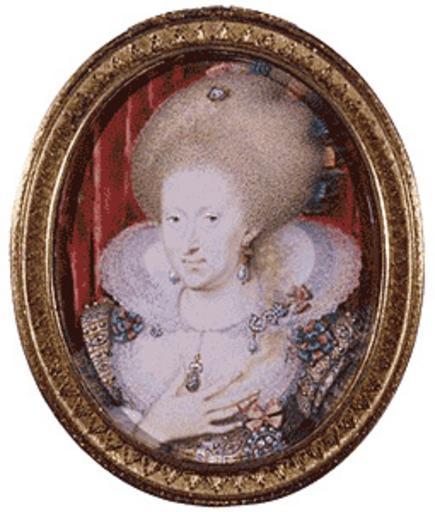 Keywords: stuart english royalty englishroyalty portrait 16th century 16thcentury 17th century 17thcentury scotland united kingdom unitedkingdom britain people plate indoor Anne of Denmark (12 December 1574 – 2 March 1619) was queen consort of Scotland, England, and Ireland as the wife of King James VI and I.[1] The second daughter of King Frederick II of Denmark, Anne married James in 1589 at the age of fourteen and bore him three children who survived infancy, including the future Charles I. She demonstrated an independent streak and a willingness to use factional Scottish politics in her conflicts with James over the custody of Prince Henry and his treatment of her friend Beatrix Ruthven. Anne appears to have loved James at first, but the couple gradually drifted and eventually lived apart, though mutual respect and a degree of affection survived.[2] In England, Anne shifted her energies from factional politics to patronage of the arts and constructed a magnificent court of her own, hosting one of the richest cultural salons in Europe.[3] After 1612, she suffered sustained bouts of ill health and gradually withdrew from the centre of court life. Though she was reported to have died a Protestant, evidence suggests that she may have converted to Catholicism at some stage in her life.[4] Historians have traditionally dismissed Anne as a lightweight queen, frivolous and self-indulgent.[5] However, recent reappraisals acknowledge Anne's assertive independence and, in particular, her dynamic significance as a patron of the arts during the Jacobean age. Anne of Denmark (12 December 1574 – 2 March 1619) was queen consort of Scotland, England, and Ireland as the wife of King James VI and I.[1] The second daughter of King Frederick II of Denmark, Anne married James in 1589 at the age of fourteen and bore him three children who survived infancy, including the future Charles I. She demonstrated an independent streak and a willingness to use factional Scottish politics in her conflicts with James over the custody of Prince Henry and his treatment of her friend Beatrix Ruthven. Anne appears to have loved James at first, but the couple gradually drifted and eventually lived apart, though mutual respect and a degree of affection survived.[2] In England, Anne shifted her energies from factional politics to patronage of the arts and constructed a magnificent court of her own, hosting one of the richest cultural salons in Europe.[3] After 1612, she suffered sustained bouts of ill health and gradually withdrew from the centre of court life. Though she was reported to have died a Protestant, evidence suggests that she may have converted to Catholicism at some stage in her life.[4] Historians have traditionally dismissed Anne as a lightweight queen, frivolous and self-indulgent.[5] However, recent reappraisals acknowledge Anne's assertive independence and, in particular, her dynamic significance as a patron of the arts during the Jacobean age. |