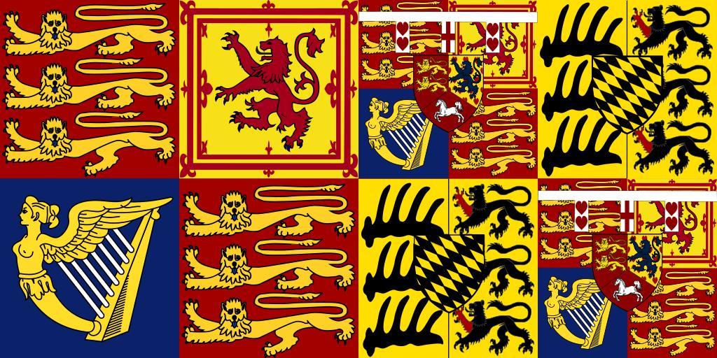 Keywords: Queen Mary of Teck Standard.svg Inkscape Royal Standard of Mary of Teck Queen Consort of George V of the United Kingdom and the British Dominions 1910-1936 and British Queen Dowager 1936-1953 Blazon Quarterly I and IV Gules three lions passant guardant in pale Or for England ; II Or a lion rampant within a double tressure flory-counter-flory Gules for Scotland ; III Azure a harp Or stringed Argent for Ireland All impaling quarterly I and IV grand-quarterly i and iv Gules three lions passant guardant in pale Or for England ; ii Or a lion rampant within a double tressure flory-counter-flory Gules for Scotland ; iii Azure a harp Or stringed Argent for Ireland ; overall an escutcheon tierced per pale and per chevron for Hanover i Gules two lions passant guardant Or for Brunswick ii Or a semy of hearts Gules a lion rampant Azure for Lunenburg iii Gules a horse courant Argent for Westfalen all differenced with a label of three points argent two hearts a Latin cross two hearts all gules; II and III Or three half-branches of hart sable for Württemberg impaling Or three lions passant sable for Hohenstaufen overall an inescutcheon couped chapé-chaussé or and argent http //flagspot net/flags/gb_roge5 html mary Tincture Change of the Württemberg's escutcheon from 50px 50px SVG elements from 50px 50px 50px 50px 50px and 50px 2008-02-26 Jake the Editor Man Queen Mary of the United Kingdom 1 Royal Standards of Consorts of the United Kingdom Mary Royal Standards of deceased members of the royal family of the United Kingdom Mary Black blue red white yellow flags Flags with harps Flags with hearts Flags with horses Flags with lions facing left Flags with two crosses Flags with two crowns Heraldic banners Coats of arms of the house of Teck |