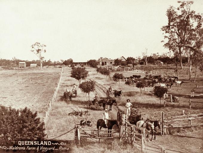 Keywords: Queensland State Archives 2517 Waldrons Farm and vineyard at Roma c 1898.png en Waldron's Farm and vineyard at Roma Vista of farm and house family horses livestock and young trees 1898 http //www archivessearch qld gov au/Image/DigitalImageDetails aspx ImageId 2517 Preferred citation Queensland State Archives Digital Image ID 2517 ID label 1109504 http //www archivessearch qld gov au/Search/AgencyDetails aspx AgencyID 1993 Lands Department Survey of Lands Branch Photographic Branch en Copyright expired Information field Decade 1890-1899 Information field Place en Maranoa Region Information field Keywords en Agriculture ll Livestock ll Horse-drawn vehicles Information field Material Type en Photographic material Information field Type en Image PD-Australia QSA media uploaded by User 99of9 Photographic material from the Queensland State Archives Queensland in the 1890s Views of Roma Queensland Farms in Queensland Vineyards |