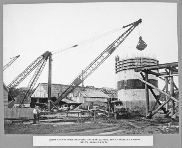 Keywords: Queensland State Archives 3650 South anchor pier dredging eastern caisson top of western caisson below ground level Brisbane 29 April 1936.png en South anchor pier dredging eastern caisson top of western caisson below ground level Brisbane Story Bridge construction 1936-04-29 http //www archivessearch qld gov au/Image/DigitalImageDetails aspx ImageId 3650 Preferred citation Queensland State Archives Digital Image ID 3650 ID label 1245559 http //www archivessearch qld gov au/Search/AgencyDetails aspx AgencyID 1995 Lands Department Survey Office Cartographic Branch Photographic Section en Copyright expired Information field Decade 1930-1939 Information field Place en Brisbane City Information field Material Type en Photographic material Information field Type en Image PD-Australia QSA media uploaded by User 99of9 Cranes in Australia Story Bridge construction Photographic material from the Queensland State Archives 1936 in Queensland Caisson engineering Bridge supports in Queensland |
