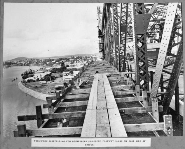 | Keywords: Queensland State Archives 4036 Formwork scaffolding for reinforced concrete footway slabs on east side of bridge Brisbane 1 April 1940.png en Formwork scaffolding for reinforced concrete footway slabs on east side of bridge Brisbane Story Bridge construction 1940-04-01 http //www archivessearch qld gov au/Image/DigitalImageDetails aspx ImageId 4036 Preferred citation Queensland State Archives Digital Image ID 4036 ID label 1249575 http //www archivessearch qld gov au/Search/AgencyDetails aspx AgencyID 1995 Lands Department Survey Office Cartographic Branch Photographic Section en Copyright expired Information field Decade 1940-1949 Information field Place en Brisbane City Information field Keywords en Bridges Information field Material Type en Photographic material Information field Type en Image PD-Australia QSA media uploaded by User 99of9 Photographic material from the Queensland State Archives 1940 in Queensland Story Bridge construction Scaffolding |
