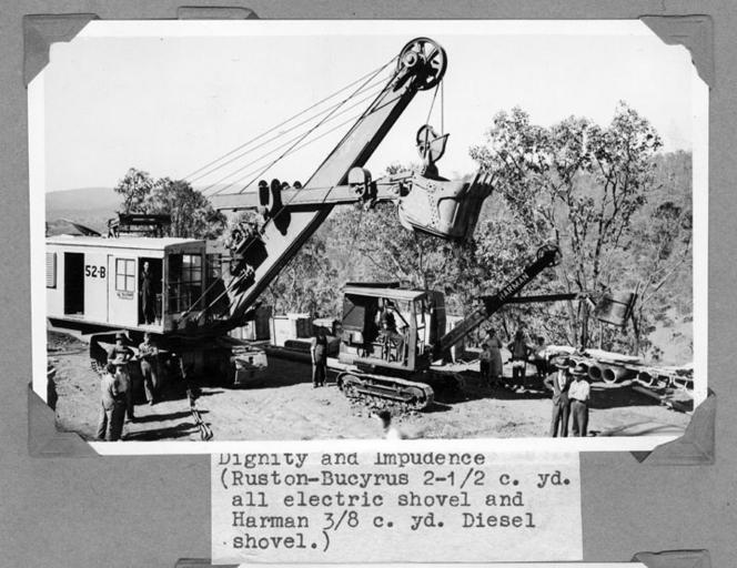 | Keywords: Queensland State Archives 4606 Dignity and Impudence RustonBucyrus 212 cyd all electric shovel and Harman 38 cyd Diesel shovel Somerset Dam January 1937.png en Dignity and Impudence Ruston-Bucyrus 2-1/2 c yd all electric shovel and Harman 3/8 c yd Diesel shovel Somerset Dam 1937-01 http //www archivessearch qld gov au/Image/DigitalImageDetails aspx ImageId 4606 Preferred citation Queensland State Archives Digital Image ID 4606 ID label 1270661 http //www archivessearch qld gov au/Search/AgencyDetails aspx AgencyID 633 Co-ordinator General's Office en Copyright expired Information field Decade 1930-1939 Information field Place en Somerset Region Information field Keywords en Earthmoving machinery Information field Material Type en Photographic material Information field Type en Image PD-Australia QSA media uploaded by User 99of9 Photographic material from the Queensland State Archives 1937 in Queensland Lake Somerset Excavators Dam construction in Australia |