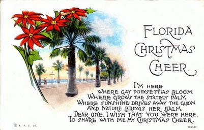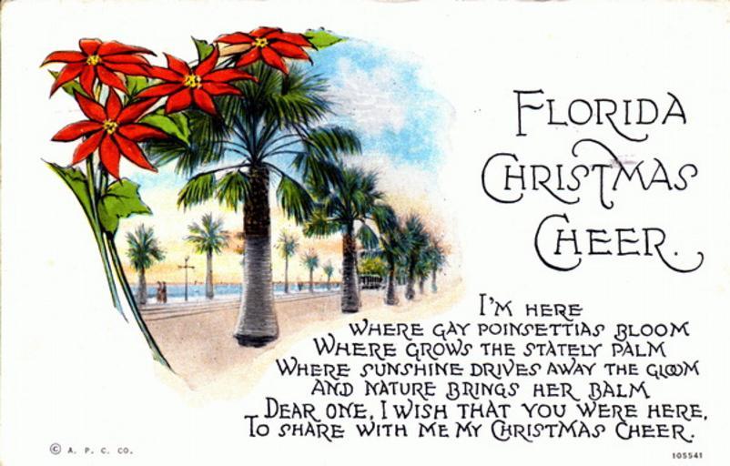 Keywords: florida state library and archives of florida statelibraryandarchivesofflorida postcards postcard collection postcardcollection mount dora mountdora 1920s flowers palm trees palmtrees poinsettias christmas holidays christmas across the commons christmasacrossthecommons plant flower white background text drawing Persistent URL: floridamemory.com/items/show/157561 PC6069 Local call number: PC0044 Title: "Florida Christmas Cheer" Date: Postmarked Mount Dora, December 20, 1927 Physical descrip: 1 postcard - col. - 9 x 14 cm. Series Title: Postcard Collection Repository: State Library and Archives of Florida 500 S. Bronough St., Tallahassee, FL, 32399-0250 USA, Contact: 850.245.6700, Archives@dos.myflorida.com Persistent URL: floridamemory.com/items/show/157561 PC6069 Local call number: PC0044 Title: "Florida Christmas Cheer" Date: Postmarked Mount Dora, December 20, 1927 Physical descrip: 1 postcard - col. - 9 x 14 cm. Series Title: Postcard Collection Repository: State Library and Archives of Florida 500 S. Bronough St., Tallahassee, FL, 32399-0250 USA, Contact: 850.245.6700, Archives@dos.myflorida.com |