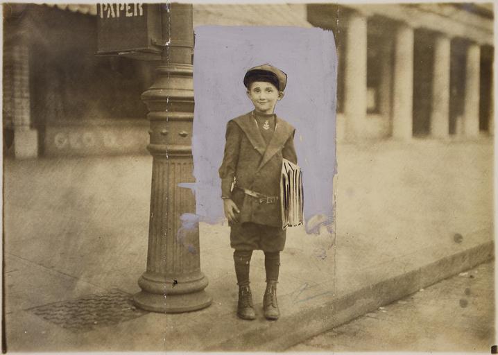 Keywords: nara:arcid=306629 u.s. national archives usnationalarchives lewis hine lewishine people Original Caption: Photograph of a 7 year old news-boy (William Parralla, 313 2nd Street, S.W.), without a badge, who tried to "short change" the photographer when he sold him a paper. "He can rustle de poipers" another boy said, April 1912 U.S. National Archives’ Local Identifier: Photographer: Hine, Lewis Subjects: Child Labor National Child Labor Committee Working Conditions Factory Persistent URL: research.archives.gov/description/306629 Repository: Still Picture Records Section, Special Media Archives Services Division (NWCS-S), National Archives at College Park, 8601 Adelphi Road, College Park, MD, 20740-6001. For information about ordering reproductions of photographs held by the Still Picture Unit, visit: www.archives.gov/research/order/still-pictures.html Reproductions may be ordered via an independent vendor. NARA maintains a list of vendors at www.archives.gov/research/order/vendors-photos-maps-dc.html Access Restrictions: Unrestricted Use Restrictions: Unrestricted Original Caption: Photograph of a 7 year old news-boy (William Parralla, 313 2nd Street, S.W.), without a badge, who tried to "short change" the photographer when he sold him a paper. "He can rustle de poipers" another boy said, April 1912 U.S. National Archives’ Local Identifier: Photographer: Hine, Lewis Subjects: Child Labor National Child Labor Committee Working Conditions Factory Persistent URL: research.archives.gov/description/306629 Repository: Still Picture Records Section, Special Media Archives Services Division (NWCS-S), National Archives at College Park, 8601 Adelphi Road, College Park, MD, 20740-6001. For information about ordering reproductions of photographs held by the Still Picture Unit, visit: www.archives.gov/research/order/still-pictures.html Reproductions may be ordered via an independent vendor. NARA maintains a list of vendors at www.archives.gov/research/order/vendors-photos-maps-dc.html Access Restrictions: Unrestricted Use Restrictions: Unrestricted |
