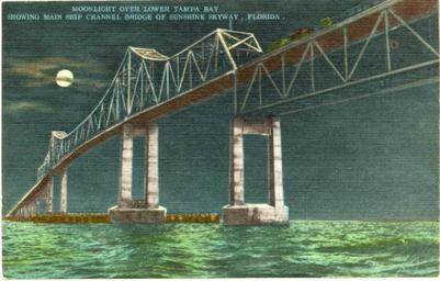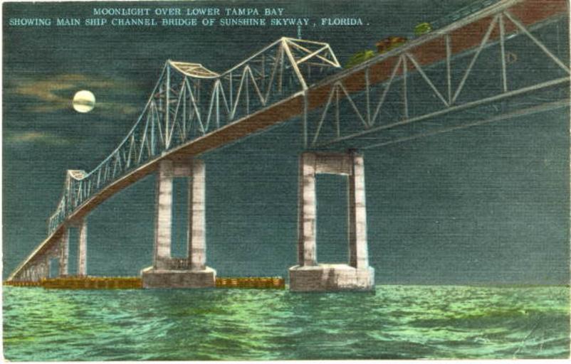 Keywords: florida state library and archives of florida statelibraryandarchivesofflorida moonlight tampa bay tampabay shipping channels shippingchannels bridges sunshine skyway sunshineskyway pinellas county pinellascounty 1950s steel bridges steelbridges postcards postcard collection postcardcollection bays water sunshine skyway bridge sunshineskywaybridge Persistent URL: floridamemory.com/items/show/158415 PC6069 Local call number: PC07247 Title: "Moonlight Over Lower Tampa Bay Showing Main Ship Channel Bridge of Sunshine Skyway, Florida" Date: ca. 1959 Physical descrip: 1 postcard - col. - 9 x 14 in. Series Title: Postcard Collection Repository: State Library and Archives of Florida 500 S. Bronough St., Tallahassee, FL, 32399-0250 USA, Contact: 850.245.6700, Archives@dos.myflorida.com Persistent URL: floridamemory.com/items/show/158415 PC6069 Local call number: PC07247 Title: "Moonlight Over Lower Tampa Bay Showing Main Ship Channel Bridge of Sunshine Skyway, Florida" Date: ca. 1959 Physical descrip: 1 postcard - col. - 9 x 14 in. Series Title: Postcard Collection Repository: State Library and Archives of Florida 500 S. Bronough St., Tallahassee, FL, 32399-0250 USA, Contact: 850.245.6700, Archives@dos.myflorida.com |