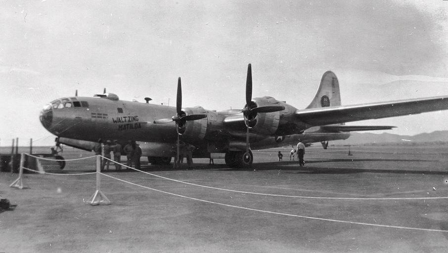 Keywords: at at RAAF Gawler, Garbutt, Townsville, October 1945 Here is a GREAT News article run in the local paper to memorialize the event: WALTZING MATILDA AT TOWNSVILLE Super-Fortress Waltzing Matilda reached Townsville at 1 p.m. on Tuesday la connection with (he appeal being, made to secure subscribers for the Fourth Victory Loan. Tuesday was the 80th day on which the Fortress has been engaged on this type of work, the mission to be concluded after arrival and inspection at Cairns to-day. Since she set out on loan work, the Super has flown about 70 hours and covered 14,000 miles, during which time all the States of Australia have been visited. Known originally as the City of Patterson (New Jersey), the Fortress aircraft was stationed at Guam and from this base took part in 38 operational missions on large cities of Japan, including Tokyo, Osaka, Kobe, Nagoya as well as many of the small islands. She also took part in one p.o.w. supply mission and, on the occasion of the signing of peace at Tokyo, "City of Patterson" was portion of the air cover for that historic event. In her flights over Japan, the Fortress has been damaged both by flak and also by enemy fighters. Brought to Australia, the plane was renamed Waltzing Matilda. This is the first visit of the crew to this country and they are enjoying their stay immensely. After completing her loan work at Cairns Waltzing Matilda will be flown back to Guam, but will first report to Brisbane where certain minor repairs will be carried out. The taking off place for the ocean hop to Guam will be Garbutt. Waltzing Matilda, has a length of 98 feet, wing span of 141 feet, height to top of rudder 80 feet. Fully load ed the aircraft weighs 70 tons. She is equipped with four engines, each of 2200 h.p.. The crew of Waltzing Matilda Is: MAJ G. A. Simeral (Officer In charge) 1LT James. W. Walker (A/C) 330th BG 1LT Donald. G. Dubbins (P) 330th BG 1LT H. D. Price (FE) 1LT David A. Wohlgamuth (N) 330th BG 1LT J. J. Allen (B) 1LT W. Almellng (Rad Ob) SGT Romane (RO) SGT Grant (LG) SGT BasUiam (CFC) SGT Plttenger (RG) SGT Harter (TG) 39th BG MSGT James M.Horst (Crew Chief) 330th BG CPL Warren E. Nelson (Astnt Crew Chief) 330th BG MSGT Horst has been with the Superfort since she left it's factory in America in January of this year. The Liason Officer on the Fortress Is Flight LT Halse (RAAF) Members of the crew— all of whom are eligible for return to service—are hoping that on reaching Guam they will receive orders to continue the Journey to their heartland. Photo, courtesy of the: SA Aviation Museum Inc 66 Lipson Street Port Adelaide 5015 South Australia australia queensland 1945 townsville b29 k54 waltzingmatilda victorytour 330thbombgroup 314thbombwing 459thbombsquadron 4469774 raafgarbutt australianwarbonddrive