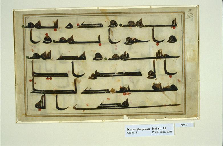 | Keywords: Qur'anic Verses WDL2435.jpg Artwork ru Стихи Ко ана fr Versets coraniques en Qur'anic Verses zh 古兰经经文 pt Versos do Alcorão ar آيات قرآنية ru Данный каллиг афический ф агмент включает в себя 85-88-й стихи 6-ой главы Ко ана под заголовком Су ат аль-Анам Скот В этой меккской <i>су е </i>позднего пе иода описывается ха акте Бога и Его п оявления В частности в стихах 85-88 описываются многие п о оки в том числе Иисус Илия и Иона кото ые могут нап авить ве ующих на путь п аведности <i>аль-си ат аль-мустаким</i> Текст выполнен че ными че нилами ш ифтом куфи по шесть ст ок на ст анице и по к аям взят в амку золотого цвета Стихи на лицевой сто оне ф агмента значительно сте лись поскольку текст был нанесен на мясную сто ону пе гамента а т етьей ст оке лицевой сто оны п иведен знак окончания пятого стиха азделяющий стихи 85 и 86 Он изоб ажен в виде косой че ты золотого цвета Остальные знаки азделения стихов на лицевой и об атной сто оне выполнены в фо ме цветка золотого цвета с точкой синего цвета в се едине Диак итические знаки изоб ажены в виде к асных точек а знаки к аткости гласных <i>сукун</i> в виде зеленых точек Д угие диак итические знаки выполнены в виде диагональных шт ихов кото ые ве оятно было добавлены в текст укописи позднее Текст выполнен в стиле типичном для Ко анов написанных го изонтально кото ые изготавливались в девятом веке на пе гаменте <br>А абская каллиг афия; Иллюмини ование укописей; Исламская каллиг афия; Ко ан fr Ce fragment calligraphique comprend les versets 85-88 du 6ème chapitre du Coran intitulé Surat al-An'am Le bétail Cette sourate de la Mecque <i>découverte tardivement </i>décrit la nature de Dieu et comment Il se révèle Les versets 85-88 en particulier décrivent un certain nombre de prophètes tels que Jésus Elias et Jonah comme capables de guider les croyants vers la bonne voie <i>al-sirat al-mustaqim</i> Le texte est en dialecte Kufi écrit à l'encre noire six lignes par page entouré d'un cadre peint en or Les versets du fragment au recto sont sensiblement usés ayant été écrits sur le côté du parchemin Sur la troisième ligne au recto apparaît un cinquième verset marqueur séparant le verset 85 du 86 Il a la forme d'une virgule d'or renversée D'autres versets marqueurs sur le recto et le verso ont la forme d'une fleur d'or avec un point bleu au centre Les signes diacritiques apparaissent comme des points rouges marquant les voyelles plus rares <i>sukun</i> comme des points verts D'autres signes diacritiques sont en forme de diagonale et ont été ajoutés ultérieurement Le texte Kufi a été écrit dans le style typique des Qur'ans à l'horizontale sur parchemin produits au cours du neuvième siècle <br>Calligraphie arabe; Enluminures; Calligraphie islamique; Coran en This calligraphic fragment includes verses 85-88 of the 6th chapter of the Qur'an entitled Surat al-An'am The Cattle This late Meccan <em>surah </em>describes the nature of God and how He reveals Himself Verses 85-88 in particular describe a number of prophets such as Jesus Elias and Jonah as capable of guiding believers to the straight path <em>al-sirat al-mustaqim</em> The text is executed in Kufi script in black ink at six lines per page surrounded by a gold painted frame Verses on the fragment's recto have worn off substantially as they were executed on the flesh side of the parchment On the recto's third line appears a fifth-verse marker separating verse 85 from 86 It is in the shape of a gold upturned virgule Other verse markers on the recto and verso take the form of a gold flower with a central blue dot Diacritics appear as red dots and marks for vowel-lessness <em>sukun</em> as green dots Other diacritical marks are shaped as diagonal strokes and may have been inserted at a later date The text's Kufi script is in the style typical of horizontal Qur'ans produced on parchment during the ninth century <br>Arabic calligraphy; Illuminations; Islamic calligraphy; Koran zh 该书法片段包含可兰经第 6 章第 85 - 88 节诗句,标题为 Surat al-An'am(城堡) 这个晚 麦加 <i>章节 </i>描述了上 的 及其如何启示 第 85-88 节诗句特别描述了 些预 家,如 稣 埃利亚斯以及约拿,他们能够指导信徒们走 直线路径 (<i>al-sirat al-mustaqim</i>) 这些库法体的文字用黑色墨水书写,每页六行,裱以金色绘画边框 反 的诗句基 上模糊不清,因为这些文字书写 羊皮纸的皮里 正 第三行 处第五节诗句的标记,将第 85 节与第 86 节分 标记形状为金色上翻 线号 正 与反 的其他诗句标记形状为中间带 点的金色花 状 发音符号用红色小点表示,元音轻读标记(<i>sukun</i>)为绿点 其他发音符号为 划线,可能是后 插入的符号 这些库法体的文字是 9 世纪用羊皮纸书写的横排可兰经的经典样式 <br>阿拉伯文书法; 插图; 伊斯兰书法; 古兰经 pt Este fragmento caligráfico inclui o
