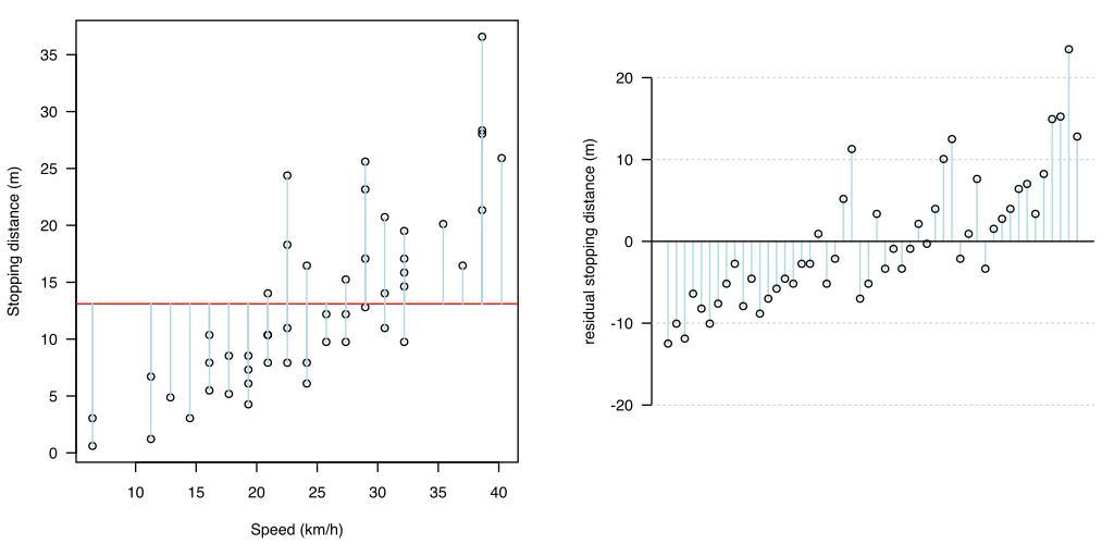 Keywords: R-car stopping distances 1920+null.svg en A graph of car stopping distances fitted with a simple null model and residual plot Own HYanWong Created with R using the following commands <pre> svg R-car_stopping_distances_1920+null svg 8 4 8 layout t 1 2 par mar c 5 4 1 2 + 0 1 cars speed kph <- cars speed 1 609344 cars dist m <- cars dist 0 3048 plot dist m ~ speed kph data cars xlab Speed km/h ylab Stopping distance m las 1 null model <- lm dist m~1 data cars This creates and stores a model lm means Linear Model abline null model col red abline is a simple function that plots a straight line segments cars speed kph fitted values null model cars speed kph fitted values null model +residuals null model col lightblue par mar c 5 5 1 1 + 0 1 plot residuals null model type h ylim c -25 25 bty n xaxt n las 2 xlab NA ylab residual stopping distance m col lightblue grid NA NULL abline h 0 points residuals null model dev off </pre> Uncategorized 2015 March 23 |