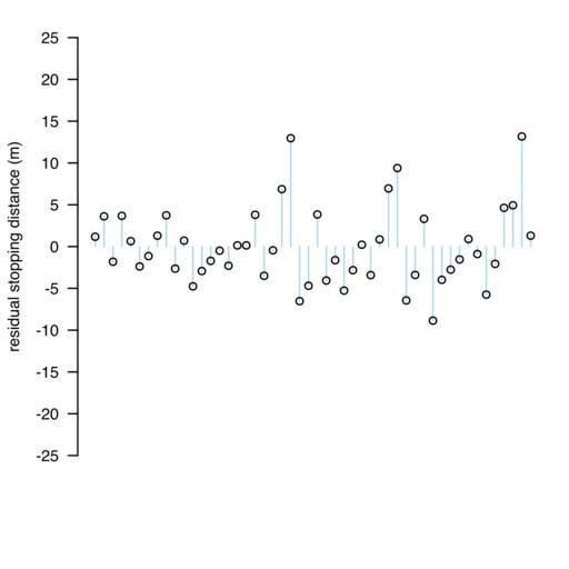 Keywords: R-car stopping distances 1920+linear-resids.svg en Residuals from a simple linear model of car stopping distances Own HYanWong 2009-01-19 Created with R using the following commands <pre>svg R-car_stopping_distances_1920+linear-resids svg 4 4 8 par mar c 5 4 1 1 + 0 1 cars speed kph <- cars speed 1 609344 cars dist m <- cars dist 0 3048 straight line model <- lm dist m~speed kph data cars This creates and stores a model lm means Linear Model plot residuals straight line model type h ylim c -25 25 yaxp c -25 25 10 bty n xaxt n las 2 xlab NA ylab residual stopping distance m col lightblue points residuals straight line model dev off </pre> Uncategorized 2015 March 23 |