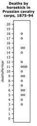 Keywords: R-horsekick totals-1D stack.svg en 1D vertical scatterplot aka vertical dotplot or stripplot example with discrete data points stacked Data von Bortkiewicz's famous dataset of deaths by horse kick in Prussian cavalry corps own HYanWong 2009-03-06 Created with R using the following commands <pre> svg file R-horsekick_totals-1D_stack svg width 1 5 height 5 pointsize 8 1D vertical scatterplot aka vertical dotplot or stripplot example with discrete data points stacked Data von Bortkiewicz's famous dataset of deaths by horse kick in Prussian cavalry corps library pscl par mar c 1 4 6 2 +0 1 stripchart tapply prussian y prussian year sum pch 1 ylab expression italic deathsPerYear method stack vertical TRUE las 1 yaxp c 0 20 20 ylim c 0 20 offset 0 9 title Deaths by\nhorsekick in\nPrussian cavalry\ncorps 1875-94 outer TRUE line -5 dev off </pre> Dot plots |