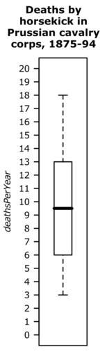 | Keywords: R-horsekick totals-boxplot.svg en Simple boxplot example with discrete data Data von Bortkiewicz's famous dataset of deaths by horse kick in Prussian cavalry corps own HYanWong 2009-03-06 Created with R using the following commands <pre> svg file R-horsekick_totals-boxplot svg width 1 5 height 5 pointsize 8 Simple boxplot example with discrete data Data von Bortkiewicz's famous dataset of deaths by horse kick in Prussian cavalry corps library pscl par mar c 1 4 6 2 +0 1 boxplot tapply prussian y prussian year sum las 1 ylab expression italic deathsPerYear yaxp c 0 20 20 ylim c 0 20 title Deaths by\nhorsekick in\nPrussian cavalry\ncorps 1875-94 outer TRUE line -5 dev off </pre> Box plots |