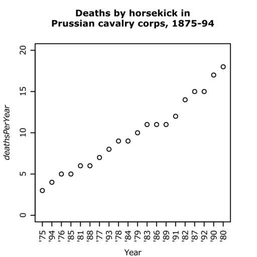 Keywords: R-horsekick totals-quantileplot.svg en Basic quantile plot example Data von Bortkiewicz's famous dataset of deaths by horse kick in Prussian cavalry corps own HYanWong 2009-03-06 Created with R using the following commands <pre> svg file R-horsekick_totals-quantileplot svg width 4 height 4 pointsize 8 Basic quantile plot example Data von Bortkiewicz's famous dataset of deaths by horse kick in Prussian cavalry corps library pscl par mar c 4 4 5 3 +0 1 X <- tapply prussian y prussian year sum plot sort X xaxt n xlab Year ylab expression italic deathsPerYear ylim c 0 20 axis 1 seq_along X paste ' names sort X sep las 3 title Deaths by horsekick in\nPrussian cavalry corps 1875-94 line 2 dev off </pre> Uncategorized 2015 March 23 |