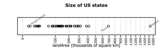 Keywords: R-US state areas-1D sqrt+extras.svg en 1D horizontal scatter plot aka dot plot or strip plot example with continuous data square root axis and outliers identified by name Own HYanWong 2009-03-06 Created with R using the following commands <pre> svg file R-US_state_areas-1D_sqrt+extras svg width 5 height 1 5 pointsize 8 1D horizontal scatter plot aka dot plot or strip plot example with continuous data square root axis and outliers identified by name par mar c 3 4 4 1 +0 1 X <- sqrt state area 2 58998811 stripchart X pch 1 xlim c 0 max X xaxt n xlab expression paste italic landArea thousands of square km mgp c 2 0 5 0 axis 1 sqrt 10 5 0 20 10 2 0 20 cex axis 0 8 mgp c 2 5 0 7 0 las 3 abline v sqrt 10 5 0 20 lty dotted col lightgray title main Size of US states line 2 5 Add outliers outliers <- order match X sort boxplot stats X out na last NA odd <- c TRUE FALSE text Xoutliersodd 1 labels state nameoutliersodd adj -0 2 cex 0 65 srt 35 xpd NA col grey40 text Xoutliers odd 1 labels state nameoutliers odd adj 1 2 cex 0 65 srt 35 xpd NA col grey40 dev off </pre> Dot plots |