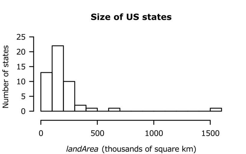 Keywords: R-US state areas-histogram.svg en Histogram example for continuous data low resolution wide bins Data US state areas own HYanWong 2009-03-06 Created with R using the following commands <pre> svg file R-US_state_areas-histogram svg width 4 height 2 5 pointsize 8 Histogram example for continuous data low resolution wide bins Data US state areas par mar c 4 4 4 2 +0 1 X <- state area 2 58998811/1000 hist X breaks 15 xlab expression paste italic landArea thousands of square km ylab Number of states main Size of US states las 1 ylim c -2 25 dev off </pre> Histograms |