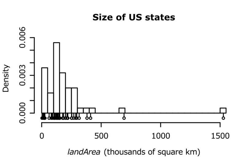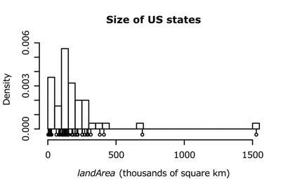 Keywords: R-US state areas-histogram hires+points.svg en Histogram example with continuous data high resolution narrow bins with actual points marked on x-axis Data US state areas Own HYanWong 2009-03-06 Created with R using the following commands <pre> svg file R-US_state_areas-histogram_hires+points svg width 4 height 2 5 pointsize 8 Histogram example with continuous data high resolution narrow bins with actual points marked on x-axis Data US state areas par mar c 4 4 4 2 +0 1 X <- state area 2 58998811/1000 hist X breaks 25 xlab expression paste italic landArea thousands of square km main Size of US states ylim c -0 0005 0 006 las 0 freq FALSE points X rep -0 0004 length X cex 0 5 segments X -0 0003 X 0 dev off </pre> Histograms |