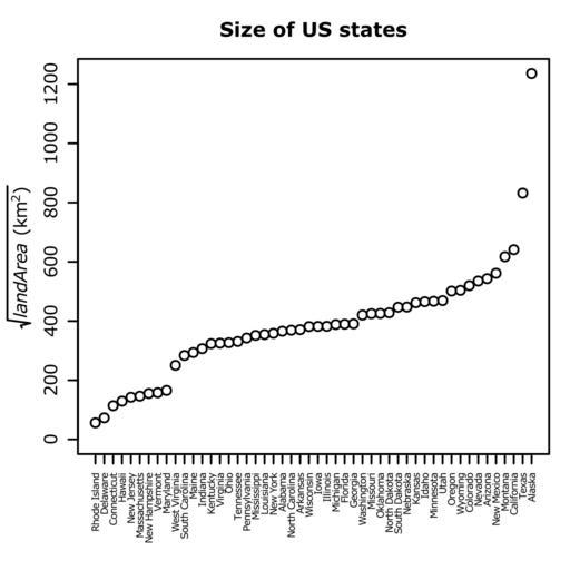 Keywords: R-US state areas-quantile sqrt.svg en Quantile plot example for square-root-transformed data Data US state areas own HYanWong 2009-03-06 Created with R using the following commands <pre> svg file R-US_state_areas-quantile_sqrt svg width 4 height 4 pointsize 8 Quantile plot example for square-root-transformed data Data US state areas par mar c 6 4 3 1 +0 1 X <- sqrt state area 2 58998811 plot sort X main Size of US states ylim c 0 max X xlab ylab expression sqrt paste italic landArea km 2 mgp c 2 5 1 0 xaxt n axis 1 seq_along state name state nameorder X cex axis 0 5 las 3 dev off </pre> Uncategorized 2015 March 23 |