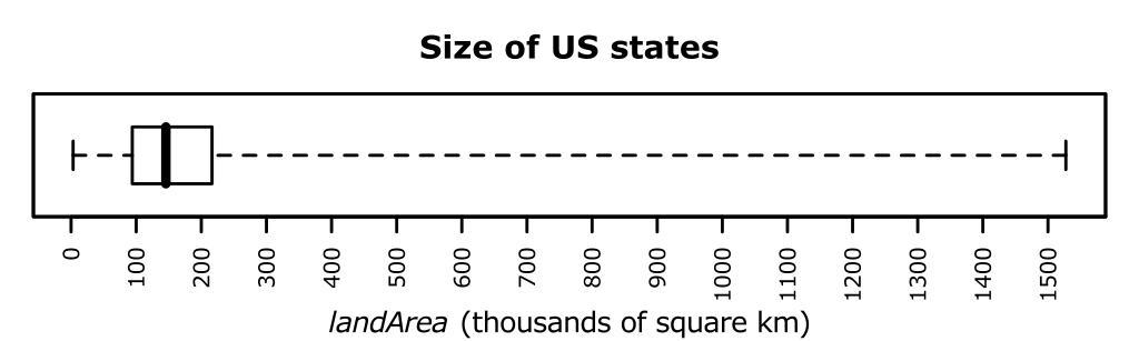 Keywords: R-US state areas-basicboxplot.svg en Basic horizontal boxplot example no outlier treatment with continuous data Data US state areas own HYanWong 2009-03-06 Created with R v svg file R-US_state_areas-basicboxplot svg width 5 height 1 5 pointsize 8 Basic horizontal boxplot example no outlier treatment with continuous data Data US state areas par mar c 4 1 3 1 +0 1 X <- state area 2 58998811/1000 stripchart X pch NA xlab expression paste italic landArea thousands of square km xaxt n dummy plot to set up axes axis 1 seq 0 2e3 100 cex axis 0 8 las 2 boxplot X range 0 add TRUE xaxt n horizontal TRUE title Size of US states dev off Box plots |