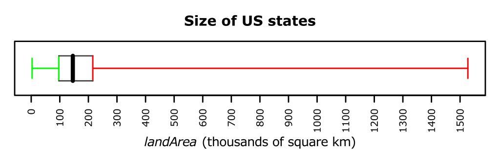 Keywords: R-US state areas-basicboxplot+colour.svg en Basic horizontal boxplot example no outlier treatment with continuous data coloured to match R-US_state_areas-1D+quartiles Data US state areas Own HYanWong 2009-03-06 Created with R using the following commands <pre> svg file R-US_state_areas-basicboxplot+colour svg width 5 height 1 5 pointsize 8 Basic horizontal boxplot example no outlier treatment with continuous data coloured to match R-US_state_areas-1D+quartiles Data US state areas par mar c 4 1 3 1 +0 1 X <- state area 2 58998811/1000 stripchart X pch NA xlab expression paste italic landArea thousands of square km xaxt n dummy plot to set up axes axis 1 seq 0 2e3 100 cex axis 0 8 las 2 roll our own boxplot to allow different coloured whiskers etc Should be equivalent to boxplot Y range 0 add TRUE corners <- xy coords quantile X c 0 25 0 25 0 75 0 75 c 0 8 1 2 1 2 0 8 segments corners x corners y corners xc 2 3 4 1 corners yc 2 3 4 1 col c green grey30 red grey30 box segments median X 0 8 median X 1 2 lwd 3 median arrows quantile X c 0 25 0 75 1 range X 1 col c green red angle 90 length 0 1 whiskers title Size of US states dev off </pre> Box plots Images with R source code |