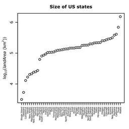 | Keywords: R-US state areas-quantile log.svg en Quantile plot example for log-transformed data Data US state areas own HYanWong 2009-03-06 Created with R using the following commands <pre> svg file R-US_state_areas-quantile_log svg width 4 height 4 pointsize 8 Quantile plot example for log-transformed data Data US state areas par mar c 6 4 3 1 +0 1 X <- log10 state area 2 58998811 plot sort X main Size of US states xlab ylab expression log10 paste italic landArea km 2 mgp c 2 5 1 0 yaxt n xaxt n axis 1 seq_along state name state nameorder X cex axis 0 5 las 3 axis 2 4 6 dev off </pre> Uncategorized 2015 March 23 |