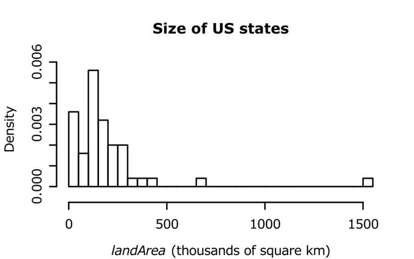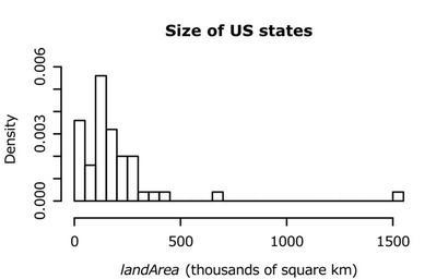 Keywords: R-US state areas-histogram hires.svg en Histogram example high resolution narrow bins Data US state areas own HYanWong 2009-03-06 Created with R using the following commands <pre> svg file R-US_state_areas-histogram_hires svg width 4 height 2 5 pointsize 8 Histogram example high resolution narrow bins Data US state areas par mar c 4 4 4 2 +0 1 X <- state area 2 58998811/1000 hist X breaks 25 xlab expression paste italic landArea thousands of square km main Size of US states ylim c -0 0005 0 006 las 0 freq FALSE dev off </pre> Histograms |