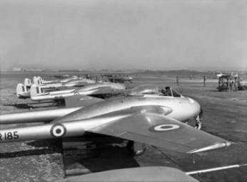 Keywords: RAAF Vampires at RAF Hal Far 1952.jpg A formation of 78 Fighter Wing RAAF De Havilland Vampire jet aircraft gets ready to taxi out to the takeoff point for the Battle of Britain fly past over Malta The Wing was stationed in Malta for garrison duty MALTA0206 ca 1952-09-15 Jeffrey Graham Jerry Sebastian Australian armed forces Image copyright Copyright expired - public domain frame cropped PD-Australia De Havilland Vampire in Australian service RAF Hal Far Black and white photographs of Malta 1952 in Malta Black and white photographs |