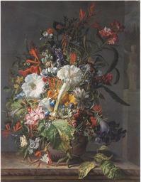 Keywords: Rachel Ruysch - Honeysuckle, Sweet Peas, Trumpet Lilies, Peonies, Hyacinths, Passion and other Flowers, a Pineapple and a Cactus in an Boettger Urn with Butterfly on a marble Ledge d185756x.jpg Artwork creator Rachel Ruysch Title Honeysuckle Sweet Peas Trumpet Lilies Peonies Hyacinths Passion Flowers and other Flowers a Pineapple and a Cactus in an Boettger Stoneware Urn with a Pale Clouded Yellow Butterfly on a marble Ledge 30847 c 1735 oil canvas cm 89 5 70 5 unknown Private collection object history sold 18 April 1997 Christie's London for 65 260 credit line http //www christies com/lotfinder/lot/rachel-ruysch-honeysuckle-sweet-peas-trumpet-185756-details aspx intObjectID 185756 Other versions PD-old-100 Rachel Ruysch 1735 paintings Images from Christie's |