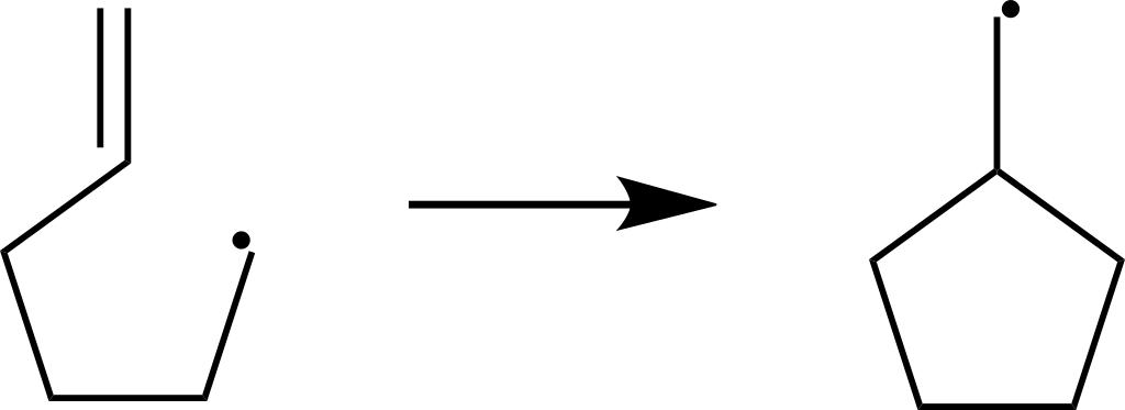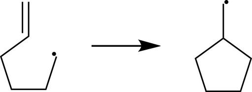 Keywords: Radical Cyclization.svg en radical cyclization example in which 5-hexenyl radical rearranges to produce a five-membered ring because this entropically and enthalpically more favored than a cyclohexl ring formation own Harbin 2009-09-06 Chemical kinetics Ring formation reactions Radical propagation |