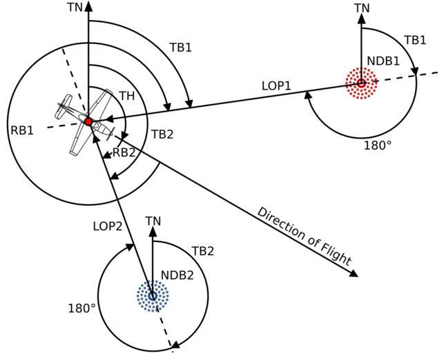 Keywords: Radio Fix on 2 Stations.svg A diagram showing how two radio stations blue and red can be used to find the position at the intersection of two Lines of Position LOP of an aircraft Key is below self-made Inkscape 0 45 12/01/2008 Inductiveload TN True North - TH True Heading - TB1 True Bearing To Station 1 NDB1 - TB2 True Bearing To Station 2 NDB1 - RB1 Relative Bearing To Station 1 - RB2 Relative Bearing To Station 2 - LOP1 Line of Position between plane and Station 1 - LOP2 Line of Position between plane and Station 2 Radio navigation |