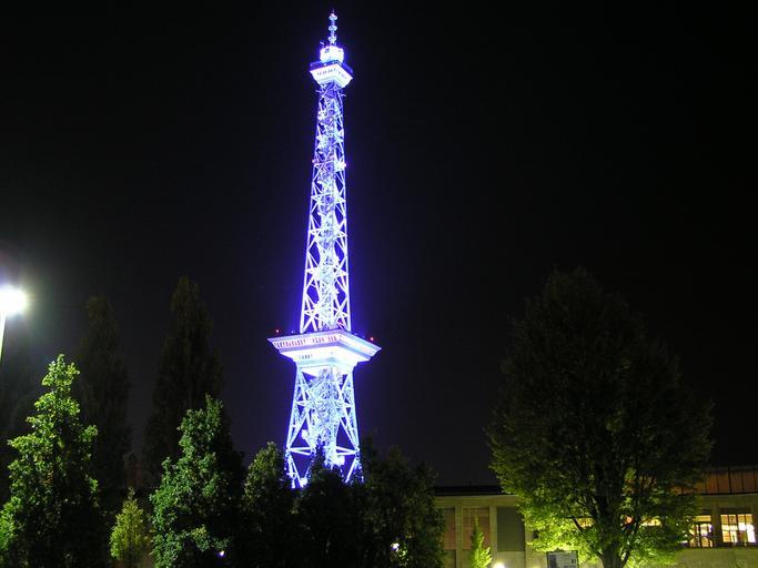 Keywords: radio tower berlin night tower illuminated blue architecture building transmission tower