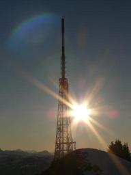 Keywords: radio tower radio mast greened transmission tower back light sun sky
