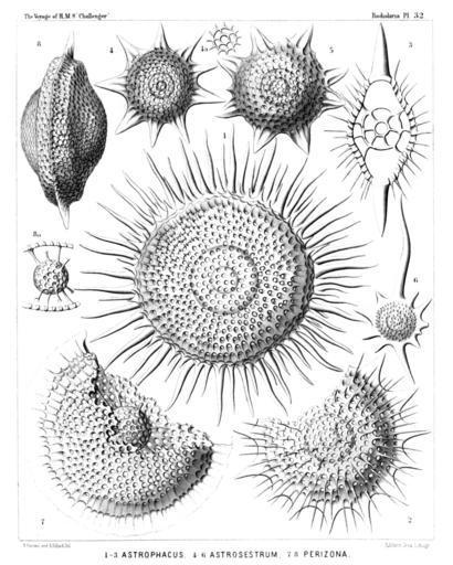 | Keywords: Radiolaria (Challenger) Plate 032.jpg follows <table> <tr> <td style text-align center; vertical-align top; colspan 3 >Plate 32 Phacodiscida </td> </tr> <tr> <td style font-size 85 ; text-align right; vertical-align top; colspan 3 >Diam </td> </tr> <tr> <td style vertical-align top; >Fig 1 Astrophacus solaris n sp </td> <td style vertical-align bottom; >×</td> <td style text-align right; vertical-align bottom; >300</td> </tr> <tr> <td style vertical-align top; >Fig 2 Astrophacus apollinis n sp </td> <td style vertical-align bottom; >×</td> <td style text-align right; vertical-align bottom; >300</td> </tr> <tr> <td style vertical-align top; >Fig 3 Astrophacus phacodiscus n sp </td> <td style vertical-align bottom; >×</td> <td style text-align right; vertical-align bottom; >300</td> </tr> <tr> <td style font-size 85 ; padding-left 3em; text-indent -1em; vertical-align top; >Vertical section through the centrum </td> </tr> <tr> <td style vertical-align top; >Fig 4 Astrosestrum ephyra n sp </td> <td style vertical-align bottom; >×</td> <td style text-align right; vertical-align bottom; >300</td> </tr> <tr> <td style font-size 85 ; padding-left 3em; text-indent -1em; vertical-align top; >Fig 4a Transverse section through the double medullary shell </td> <td style vertical-align bottom; >×</td> <td style text-align right; vertical-align bottom; >300</td> </tr> <tr> <td style vertical-align top; >Fig 5 Astrosestrum nauphanta n sp </td> <td style vertical-align bottom; >×</td> <td style text-align right; vertical-align bottom; >300</td> </tr> <tr> <td style vertical-align top; >Fig 6 Phacostylus caudatus n sp vel Astrosestrum caudatum </td> <td style vertical-align bottom; >×</td> <td style text-align right; vertical-align bottom; >200</td> </tr> <tr> <td style vertical-align top; >Fig 7 Perizona scutella n sp </td> <td style vertical-align bottom; >×</td> <td style text-align right; vertical-align bottom; >400</td> </tr> <tr> <td style vertical-align top; >Fig 8 Perizona pterygota n sp </td> <td style vertical-align bottom; >×</td> <td style text-align right; vertical-align bottom; >400</td> </tr> <tr> <td style font-size 85 ; padding-left 3em; text-indent -1em; vertical-align top; >Fig 8a Medullary shells and radial beams connecting them with the disk </td> <td style vertical-align bottom; >×</td> <td style text-align right; vertical-align bottom; >300</td> </tr> </table> https //archive org/details/reportonradiolar00haecrich 1887 Ernst Haeckel 1834-1919 ; engravings by Adolf Giltsch 1852-1911 PD-old-auto-1923 1919 Report on the Radiolaria |