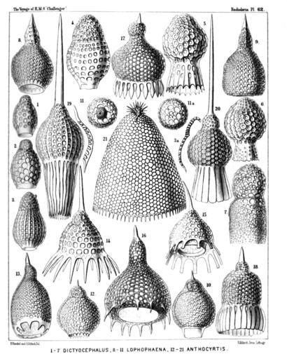 Keywords: Radiolaria (Challenger) Plate 062.jpg follows <table> <tr> <td style text-align center; vertical-align top; colspan 3 >Plate 62 Anthocyrtida Sethocyrtida et Phormocyrtida </td> </tr> <tr> <td style font-size 85 ; text-align right; vertical-align top; colspan 3 >Diam </td> </tr> <tr> <td style vertical-align top; >Fig 1 Dictyocephalus australis n sp </td> <td style vertical-align bottom; >×</td> <td style text-align right; vertical-align bottom; >300</td> </tr> <tr> <td style vertical-align top; >Fig 2 Dictyocephalus mediterraneus n sp </td> <td style vertical-align bottom; >×</td> <td style text-align right; vertical-align bottom; >300</td> </tr> <tr> <td style vertical-align top; >Fig 3 Sethamphora costata n sp vel Dictyocephalus costatus </td> <td style vertical-align bottom; >×</td> <td style text-align right; vertical-align bottom; >300</td> </tr> <tr> <td style vertical-align top; >Fig 4 Dictyocephalus amphora n sp </td> <td style vertical-align bottom; >×</td> <td style text-align right; vertical-align bottom; >400</td> </tr> <tr> <td style vertical-align top; >Fig 5 Cycladophora favosa n sp an Dictyocephalus </td> <td style vertical-align bottom; >×</td> <td style text-align right; vertical-align bottom; >400</td> </tr> <tr> <td style vertical-align top; >Fig 6 Cycladophora favosa n sp an Dictyocephalus </td> <td style vertical-align bottom; >×</td> <td style text-align right; vertical-align bottom; >400</td> </tr> <tr> <td style font-size 85 ; padding-left 3em; text-indent -1em; vertical-align top; >A variety with obliterated ribs </td> </tr> <tr> <td style vertical-align top; >Fig 7 Dictyocephalus globiceps n sp </td> <td style vertical-align bottom; >×</td> <td style text-align right; vertical-align bottom; >400</td> </tr> <tr> <td style vertical-align top; >Fig 8 Sethocorys achillis n sp </td> <td style vertical-align bottom; >×</td> <td style text-align right; vertical-align bottom; >400</td> </tr> <tr> <td style vertical-align top; >Fig 9 Sethocyrtis oxycephalis n sp </td> <td style vertical-align bottom; >×</td> <td style text-align right; vertical-align bottom; >400</td> </tr> <tr> <td style vertical-align top; >Fig 10 Sethocorys odysseus n sp </td> <td style vertical-align bottom; >×</td> <td style text-align right; vertical-align bottom; >400</td> </tr> <tr> <td style vertical-align top; >Fig 11 Sethocyrtis agamemnonis n sp </td> <td style vertical-align bottom; >×</td> <td style text-align right; vertical-align bottom; >300</td> </tr> <tr> <td style font-size 85 ; padding-left 3em; text-indent -1em; vertical-align top; >Seen from above apical view </td> </tr> <tr> <td style vertical-align top; >Fig 11A Sethocyrtis agamemnonis n sp </td> <td style vertical-align bottom; >×</td> <td style text-align right; vertical-align bottom; >300</td> </tr> <tr> <td style font-size 85 ; padding-left 3em; text-indent -1em; vertical-align top; >Seen from above after removal of the cephalis </td> </tr> <tr> <td style vertical-align top; >Fig 12 Anthocyrtium pyrum n sp </td> <td style vertical-align bottom; >×</td> <td style text-align right; vertical-align bottom; >400</td> </tr> <tr> <td style vertical-align top; >Fig 13 Anthocyrtis ovata n sp </td> <td style vertical-align bottom; >×</td> <td style text-align right; vertical-align bottom; >300</td> </tr> <tr> <td style vertical-align top; >Fig 14 Anthocyrtium chrysanthemum n sp</td> <td style vertical-align bottom; >×</td> <td style text-align right; vertical-align bottom; >400</td> </tr> <tr> <td style vertical-align top; >Fig 15 Anthocyrtidium ligularia n sp </td> <td style vertical-align bottom; >×</td> <td style text-align right; vertical-align bottom; >400</td> </tr> <tr> <td style vertical-align top; >Fig 16 Anthocyrtidium cineraria n sp </td> <td style vertical-align bottom; >×</td> <td style text-align right; vertical-align bottom; >400</td> </tr> <tr> <td style vertical-align top; >Fig 17 Anthocyrtium campanula n sp </td> <td style vertical-align bottom; >×</td> <td style text-align right; vertical-align bottom; >400</td> </tr> <tr> <td style vertical-align top; >Fig 18 Anthocyrtium doronicum n sp </td> <td style vertical-align bottom; >×</td> <td style text-align right; vertical-align bottom; >300</td> </tr> <tr> <td style vertical-align top; >Fig 19 Anthocyrtium flosculus n sp </td> <td style vertical-align bottom; >×</td> <td style text-align right; vertical-align bottom; >300</td> </tr> <tr> <td style vertical-align top; >Fig 20 Anthocyrtium adonis n sp </td> <td style vertical-align bottom; >×</td> <td style text-align right; vertical-align bottom; >300</td> </tr> <tr> <td style vertical-align top; >Fig 21 Sethoconus anthocyrtis n sp vel Anthocyrtium sethoconium </td> <td style vertical-align bottom; >×</td> <td style text-align right; vertical-align bottom; >300</td> </tr> </table> https //archive org/details/reportonradiolar00haecrich 1887 Ernst Haeckel 1834-1919 ; engravings by Adolf Giltsch 1852-1911 PD-old-auto-1923 1919 Report on the Radiolaria |