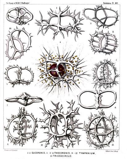 | Keywords: Radiolaria (Challenger) Plate 082.jpg follows <table> <tr> <td style text-align center; vertical-align top; colspan 3 >Plate 82 Coronida et Tympanida </td> </tr> <tr> <td style font-size 85 ; text-align right; vertical-align top; colspan 3 >Diam </td> </tr> <tr> <td style vertical-align top; >Fig 1 Coronidium cervicorne n sp </td> <td style vertical-align bottom; >×</td> <td style text-align right; vertical-align bottom; >400</td> </tr> <tr> <td style font-size 85 ; padding-left 3em; text-indent -1em; vertical-align top; >Seen from the apical pole </td> </tr> <tr> <td style vertical-align top; >Fig 2 Coronidium acacia n sp </td> <td style vertical-align bottom; >×</td> <td style text-align right; vertical-align bottom; >300</td> </tr> <tr> <td style vertical-align top; >Fig 3 Eucoronis angulata n sp </td> <td style vertical-align bottom; >×</td> <td style text-align right; vertical-align bottom; >400</td> </tr> <tr> <td style font-size 85 ; padding-left 3em; text-indent -1em; vertical-align top; >Half from the apical half from the dorsal side </td> </tr> <tr> <td style vertical-align top; >Fig 4 Eucoronis challengeri n sp </td> <td style vertical-align bottom; >×</td> <td style text-align right; vertical-align bottom; >400</td> </tr> <tr> <td style font-size 85 ; padding-left 3em; text-indent -1em; vertical-align top; >The red central capsule encloses a large ovate nucleus and is surrounded by numerous xanthellæ </td> </tr> <tr> <td style vertical-align top; >Fig 5 Eucoronis nephrospyris n sp </td> <td style vertical-align bottom; >×</td> <td style text-align right; vertical-align bottom; >300</td> </tr> <tr> <td style vertical-align top; >Fig 6 Eucoronis perspicillum n sp </td> <td style vertical-align bottom; >×</td> <td style text-align right; vertical-align bottom; >300</td> </tr> <tr> <td style vertical-align top; >Fig 7 Coronidium dyostephanus n sp </td> <td style vertical-align bottom; >×</td> <td style text-align right; vertical-align bottom; >400</td> </tr> <tr> <td style font-size 85 ; padding-left 3em; text-indent -1em; vertical-align top; >Seen from the apical pole </td> </tr> <tr> <td style vertical-align top; >Fig 8 Coronidium diadema n sp </td> <td style vertical-align bottom; >×</td> <td style text-align right; vertical-align bottom; >300</td> </tr> <tr> <td style vertical-align top; >Fig 9 Acrocubus octopylus n sp </td> <td style vertical-align bottom; >×</td> <td style text-align right; vertical-align bottom; >300</td> </tr> <tr> <td style vertical-align top; >Fig 10 Parastephanus asymmetricus n sp </td> <td style vertical-align bottom; >×</td> <td style text-align right; vertical-align bottom; >400</td> </tr> <tr> <td style vertical-align top; >Fig 11 Eutympanium militare n sp </td> <td style vertical-align bottom; >×</td> <td style text-align right; vertical-align bottom; >400</td> </tr> <tr> <td style font-size 85 ; padding-left 3em; text-indent -1em; vertical-align top; >Oblique view </td> </tr> <tr> <td style vertical-align top; >Fig 12 Lithocubus astragalus n sp </td> <td style vertical-align bottom; >×</td> <td style text-align right; vertical-align bottom; >400</td> </tr> <tr> <td style vertical-align top; >Fig 13 Trissocircus globus n sp </td> <td style vertical-align bottom; >×</td> <td style text-align right; vertical-align bottom; >400</td> </tr> </table> https //archive org/details/reportonradiolar00haecrich 1887 Ernst Haeckel 1834-1919 ; engravings by Adolf Giltsch 1852-1911 PD-old-auto-1923 1919 Report on the Radiolaria |