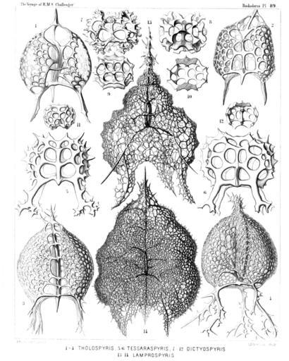 | Keywords: Radiolaria (Challenger) Plate 089.jpg follows <table> <tr> <td style text-align center; vertical-align top; colspan 3 >Plate 89 Zygospyrida Tholospyrida et Androspyrida </td> </tr> <tr> <td style font-size 85 ; text-align right; vertical-align top; colspan 3 >Diam </td> </tr> <tr> <td style vertical-align top; >Fig 1 Tholospyris tripodiscus n sp </td> <td style vertical-align bottom; >×</td> <td style text-align right; vertical-align bottom; >400</td> </tr> <tr> <td style font-size 85 ; padding-left 3em; text-indent -1em; vertical-align top; >Ventral side </td> </tr> <tr> <td style vertical-align top; >Fig 2 Tholospyris fenestrata n sp </td> <td style vertical-align bottom; >×</td> <td style text-align right; vertical-align bottom; >400</td> </tr> <tr> <td style font-size 85 ; padding-left 3em; text-indent -1em; vertical-align top; >Dorsal side </td> </tr> <tr> <td style vertical-align top; >Fig 3 Tholospyris ramosa n sp </td> <td style vertical-align bottom; >×</td> <td style text-align right; vertical-align bottom; >400</td> </tr> <tr> <td style font-size 85 ; padding-left 3em; text-indent -1em; vertical-align top; >Dorsal side </td> </tr> <tr> <td style vertical-align top; >Fig 4 Tholospyris cupola n sp </td> <td style vertical-align bottom; >×</td> <td style text-align right; vertical-align bottom; >400</td> </tr> <tr> <td style font-size 85 ; padding-left 3em; text-indent -1em; vertical-align top; >Ventral side </td> </tr> <tr> <td style vertical-align top; >Fig 5 Therospyris leo n sp </td> <td style vertical-align bottom; >×</td> <td style text-align right; vertical-align bottom; >400</td> </tr> <tr> <td style font-size 85 ; padding-left 3em; text-indent -1em; vertical-align top; >Ventral side </td> </tr> <tr> <td style vertical-align top; >Fig 6 Therospyris felis n sp </td> <td style vertical-align bottom; >×</td> <td style text-align right; vertical-align bottom; >400</td> </tr> <tr> <td style font-size 85 ; padding-left 3em; text-indent -1em; vertical-align top; >Dorsal side </td> </tr> <tr> <td style vertical-align top; >Fig 7 Dictyospyris stalactites n sp </td> <td style vertical-align bottom; >×</td> <td style text-align right; vertical-align bottom; >400</td> </tr> <tr> <td style font-size 85 ; padding-left 3em; text-indent -1em; vertical-align top; >Ventral side </td> </tr> <tr> <td style vertical-align top; >Fig 8 Dictyospyris anthophora n sp </td> <td style vertical-align bottom; >×</td> <td style text-align right; vertical-align bottom; >400</td> </tr> <tr> <td style font-size 85 ; padding-left 3em; text-indent -1em; vertical-align top; >Ventral side </td> </tr> <tr> <td style vertical-align top; >Fig 9 Dictyospyris mammillaris n sp </td> <td style vertical-align bottom; >×</td> <td style text-align right; vertical-align bottom; >400</td> </tr> <tr> <td style font-size 85 ; padding-left 3em; text-indent -1em; vertical-align top; >Ventral side </td> </tr> <tr> <td style vertical-align top; >Fig 10 Dictyospyris mammillaris n sp </td> <td style vertical-align bottom; >×</td> <td style text-align right; vertical-align bottom; >400</td> </tr> <tr> <td style font-size 85 ; padding-left 3em; text-indent -1em; vertical-align top; >Frontal section </td> </tr> <tr> <td style vertical-align top; >Fig 11 Dictyospyris distoma n sp </td> <td style vertical-align bottom; >×</td> <td style text-align right; vertical-align bottom; >300</td> </tr> <tr> <td style font-size 85 ; padding-left 3em; text-indent -1em; vertical-align top; >Ventral side </td> </tr> <tr> <td style vertical-align top; >Fig 12 Dictyospyris distoma n sp </td> <td style vertical-align bottom; >×</td> <td style text-align right; vertical-align bottom; >300</td> </tr> <tr> <td style font-size 85 ; padding-left 3em; text-indent -1em; vertical-align top; >Frontal section </td> </tr> <tr> <td style vertical-align top; >Fig 13 Lamprospyris darwinii n sp </td> <td style vertical-align bottom; >×</td> <td style text-align right; vertical-align bottom; >300</td> </tr> <tr> <td style font-size 85 ; padding-left 3em; text-indent -1em; vertical-align top; >Ventral side </td> </tr> <tr> <td style vertical-align top; >Fig 14 Lamprospyris huxleyi n sp </td> <td style vertical-align bottom; >×</td> <td style text-align right; vertical-align bottom; >300</td> </tr> <tr> <td style font-size 85 ; padding-left 3em; text-indent -1em; vertical-align top; >Ventral side </td> </tr> </table> https //archive org/details/reportonradiolar00haecrich 1887 Ernst Haeckel 1834-1919 ; engravings by Adolf Giltsch 1852-1911 PD-old-auto-1923 1919 Report on the Radiolaria |
