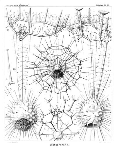 | Keywords: Radiolaria (Challenger) Plate 112.jpg follows <table> <tr> <td style text-align center; vertical-align top; colspan 3 >Plate 112 Cannosphærida </td> </tr> <tr> <td style font-size 85 ; text-align right; vertical-align top; colspan 3 >Diam </td> </tr> <tr> <td style font-size 85 ; padding-left 3em; text-indent -1em; vertical-align top; >Cannosphærida </td> </tr> <tr> <td style vertical-align top; >Fig 1 Cannosphæra antarctica n sp </td> <td style vertical-align bottom; >×</td> <td style text-align right; vertical-align bottom; >50</td> </tr> <tr> <td style font-size 85 ; padding-left 3em; text-indent -1em; vertical-align top; >The entire shell The inner mammillate shell from the month of which is prominent the phæodium in connected by numerous radial beams with the outer shell </td> </tr> <tr> <td style vertical-align top; >Fig 2 Cannosphæra antarctica n sp </td> <td style vertical-align bottom; >×</td> <td style text-align right; vertical-align bottom; >200</td> </tr> <tr> <td style font-size 85 ; padding-left 3em; text-indent -1em; vertical-align top; >The inner shell from the mouth of which is prominent the phæodium and a single hexagonal mesh of the outer shell connected with the former by thin radial threads </td> </tr> <tr> <td style vertical-align top; >Fig 3 Cannosphæra antarctica n sp </td> <td style vertical-align bottom; >×</td> <td style text-align right; vertical-align bottom; >200</td> </tr> <tr> <td style font-size 85 ; padding-left 3em; text-indent -1em; vertical-align top; >A single radial spine with four terminal branches </td> </tr> <tr> <td style vertical-align top; >Fig 4 Cannosphæra pacifica n sp </td> <td style vertical-align bottom; >×</td> <td style text-align right; vertical-align bottom; >200</td> </tr> <tr> <td style font-size 85 ; padding-left 3em; text-indent -1em; vertical-align top; >The inner shell exhibiting on its base the widely open mouth and in its upper half the transparent spherical central capsule with its nucleus Of the outer shell which is connected with the inner by thin radial threads only a few polygonal meshes are visible </td> </tr> <tr> <td style vertical-align top; >Fig 5 Cannosphæra atlantica n sp </td> <td style vertical-align bottom; >×</td> <td style text-align right; vertical-align bottom; >200</td> </tr> <tr> <td style font-size 85 ; padding-left 3em; text-indent -1em; vertical-align top; >The inner shell connected by spiny radial beams with the outer shell a quadrant only of which is visible </td> </tr> <tr> <td style vertical-align top; >Fig 6 Cannosphæra atlantica n sp </td> <td style vertical-align bottom; >×</td> <td style text-align right; vertical-align bottom; >200</td> </tr> <tr> <td style font-size 85 ; padding-left 3em; text-indent -1em; vertical-align top; >A single radial spine with five terminal branches </td> </tr> </table> https //archive org/details/reportonradiolar00haecrich 1887 Ernst Haeckel 1834-1919 ; engravings by Adolf Giltsch 1852-1911 PD-old-auto-1923 1919 Report on the Radiolaria |