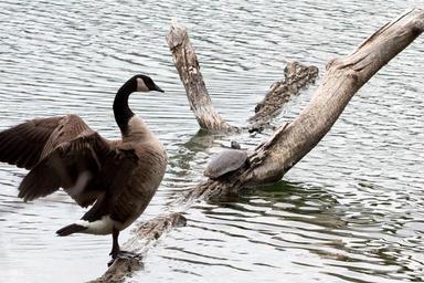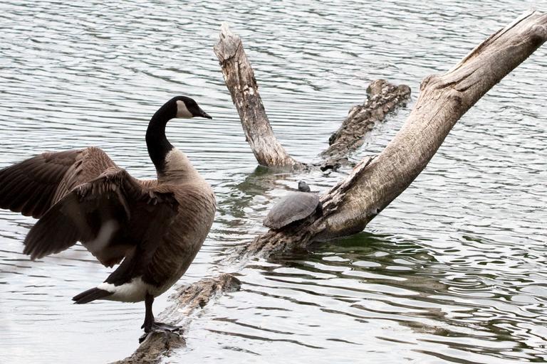 Keywords: Radnor Lake wildlife.jpg en A Canadian goose and turtle at Radnor Lake in Nashville Tennessee own Kaldari 2009-03-22 Radnor Lake Branta canadensis Unidentified Testudines