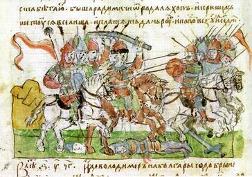 | Keywords: Radzimičy. Радзімічы (XV).jpg a miniature from medieval Radzivill Chronicle showing an ancient tribe Radimichs be-tarask ініяту а Радзівілаўскага летапісу Пе амога Воўчага Хваста ваяводы кіеўскага князя Ўладзіме а Сьвятаславіча над адзімічамі на ацэ Пішчане ў 984 http //spadczyna com/history/b_his_2_rus_1 htm Спадчына Бела усі гісто ыя і мастацтва Author century 15 PD-old Details of Radzivill Chronicle History of Belarus East Slavs Cavalry in art Military people in art | ||||
