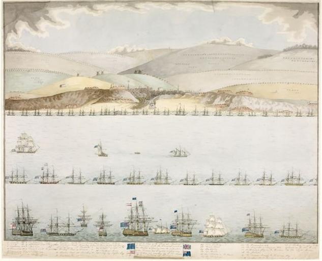 | Keywords: Raid on Boulogne 1804 colour.jpg en Plan and key The Attack on Boulogne Oct 1804 Watercolour showing the situation prior to the British assault on the night of 2 October 1804 In the foreground is the main British squadron with Admiral Lord Keith's flagship the two-decker 'Monarch' 74 guns in the centre and frigates and sloops around it Behind them is a line of smaller British sloops and brigs Behind that to the left a Dutch merchant ship is about to be intercepted Some of the French invasion craft are in a line close to the shore behind an invisible sandbank The town and harbour of Boulogne are behind also filled with invasion craft and with strong shoreline fortifications Napoleon's 'Army of England' are shown encamped in the heights above the town http //www nmm ac uk/collections/nelson/viewRepro cfm reproID PZ6989 picture 1 content The National Maritime Museum E D Lewis 1804 PD-old-100 Naval battles in art |