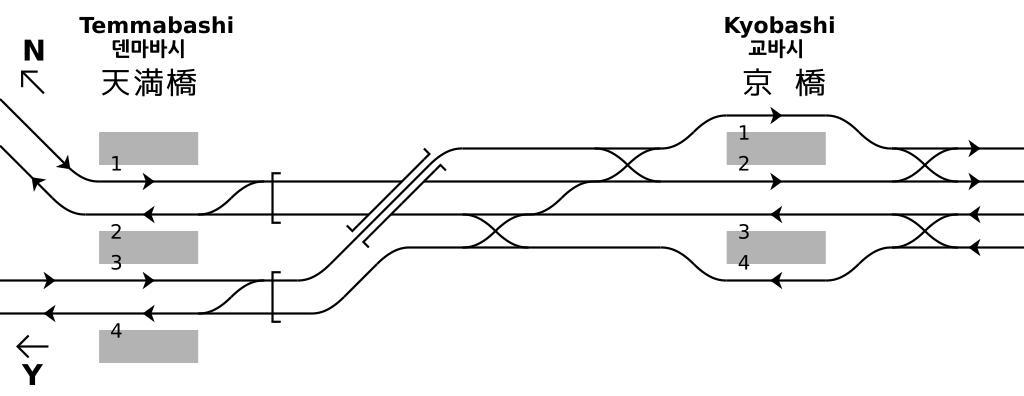 | Keywords: Rail Tracks map between Keihan Temmabashi and Kyobashi Station.svg Keihan Electric Railway between Temmabashi Station and Kyōbashi Station in Osaka Japan Reference material <br /> DENKISHA KENKYUKAI THE RAILWAY PICTORIAL Tetsudō Pictorial Japanese magazine Vol 59-8 No 822 Extra edition - 京阪電気鉄道 Keihan Electric Railway insert page at end 2009-08 <br /> Keihan Electric Railway official homepage - OKEIHAN net - station map Japanese - http //www keihan co jp/traffic/eki/pdf/020 pdf Temmabashi Station http //www keihan co jp/traffic/eki/pdf/030 pdf Kyobashi Station(PDF files) 大阪市にある京阪 天 橋-京橋駅間鉄道配線略図<br /> 参 文献:<br /> 電気車研究会 鉄道ピクトリアル 第59巻第8号 巻第822号 2009年8 臨時増刊号 特集 - 京阪電気鉄道 巻 折込 京阪電気鉄道線路配線略図 2009 6 3現 <br /> 京阪電気鉄道公式ホームページ おけいはん.ねっと - 構内図-http //www keihan co jp/traffic/eki/pdf/020 pdf 天 橋駅 http //www keihan co jp/traffic/eki/pdf/030 pdf 京橋駅(PDFファイル) 凡例は駅配線図テンプレートを参照 Plan de voies entre gare de Keihan Temmabashi et Kyōbashi Ligne Keihan Ōsaka Japon Tawashi2006 created from icons in Category Rail_tracks_map_template 2010-03-18 Tawashi2006 with http //kiritachinoboru tripod com/pdv2svg_en html pdv2svg Tawashi2006 Rail track diagrams of Keihan Electric Railway train stations Kyōbashi Station Osaka |